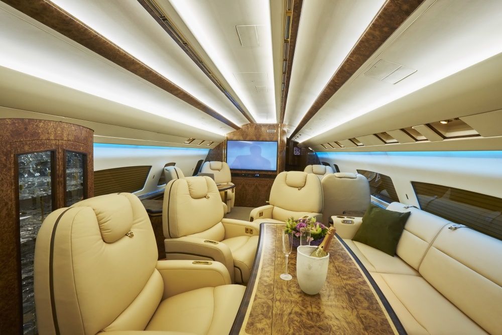 The aircraft is equipped with a separate business suite with a private lavatory, a spacious conference room, a VIP lounge, and seats for accompanying persons. The refurbished cabin is equipped with full-color RGB lights capable of reproducing all color tints.